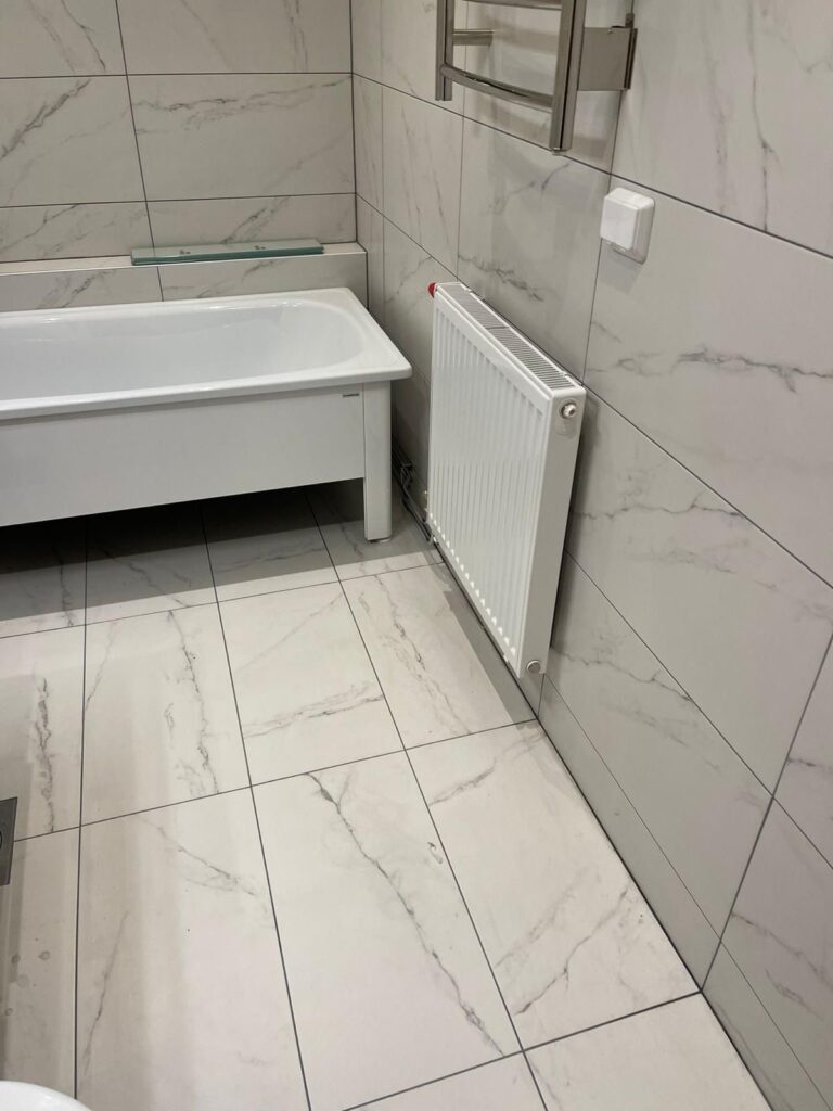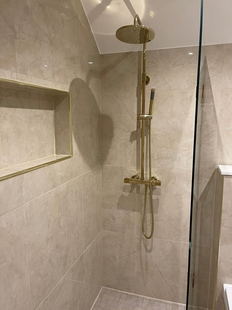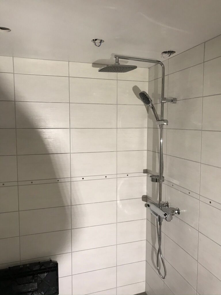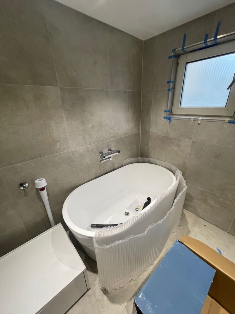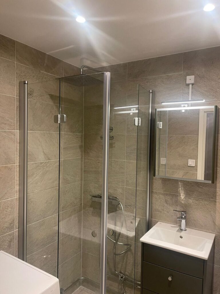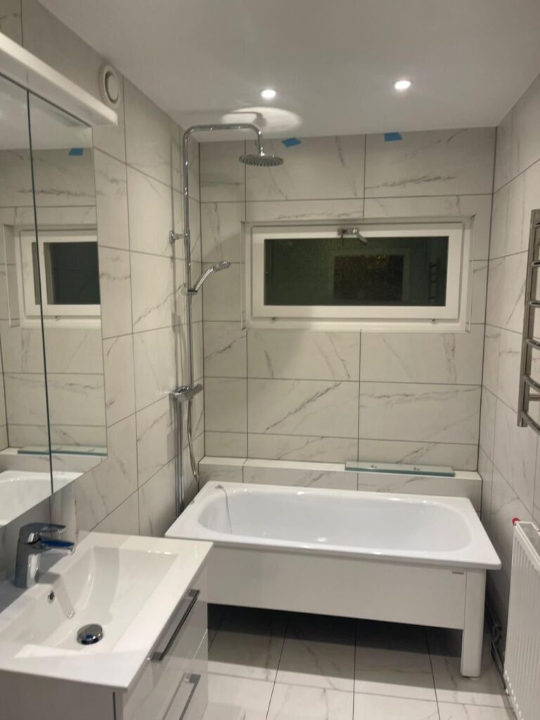 Totalrenovering av ett badrum med nytt kakel, golvvärme och modern inredning.